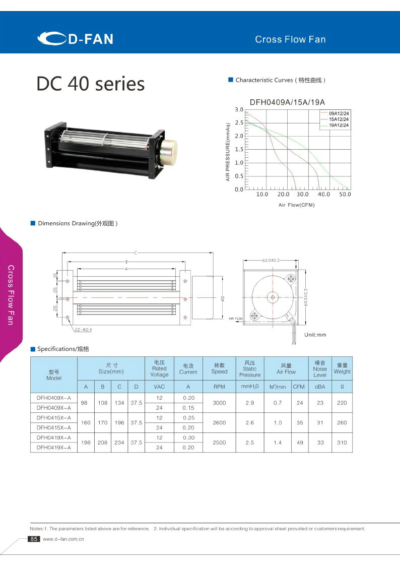 DC FAN橫流風(fēng)扇040參數(shù) DC FAN橫流風(fēng)扇040曲線圖 DC FAN橫流風(fēng)扇040外觀圖